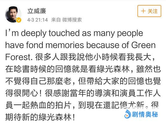 4月3日晚上9点多,立威廉也因为《绿光森林》被翻拍一事在微博上发文回应。他表示:“很多人跟我说他小时候看我的戏长大,而且在念书时的回忆就是看绿光森林。虽然我不觉得自己那么老,但能带给大家这么多回忆,也很开心。”立威廉还感谢了这部剧的导演和所有演职人员,并表示非常期待新的《绿光森林》。