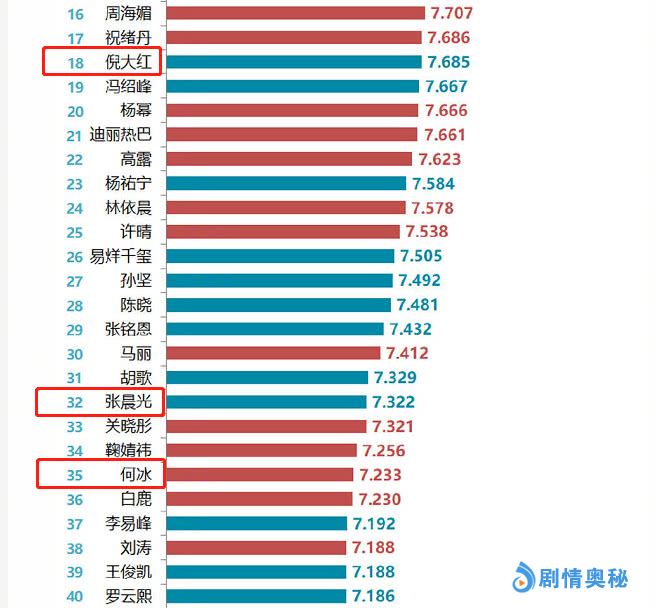从公布的结果来看,上榜的大部分都是年轻演员,几乎很少看到老戏骨的名字。而且就算是上榜了,排名也比较靠后,远远低于鲜肉或流量演员的排名。比如老戏骨何冰、张晨光,就分别排在第35名和第32名。而最近因为在热播剧《都挺好》中饰演“苏大强”一角而大火的老戏骨倪大红,也仅仅排在第18位。
