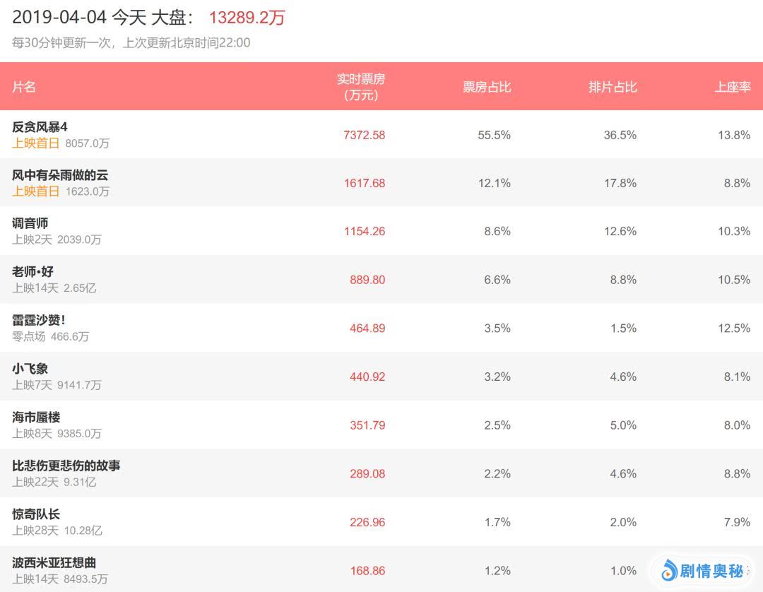 (数据来源猫眼专业版,截止至2019年4月4日22:00)