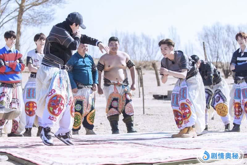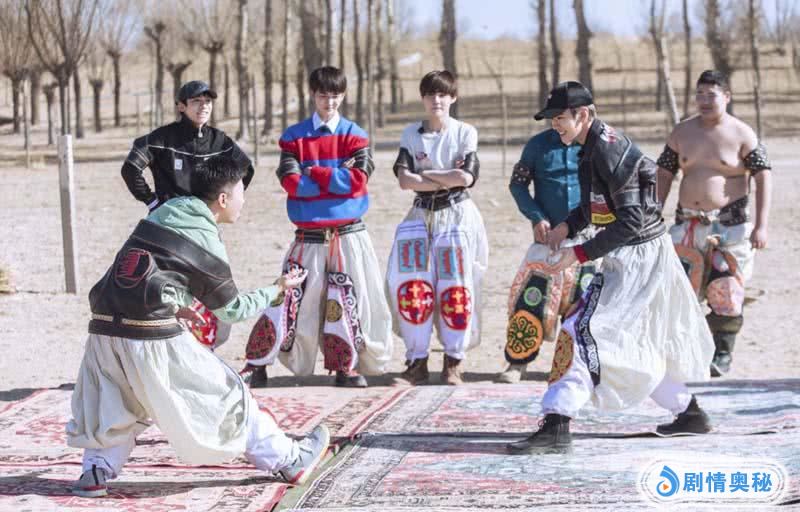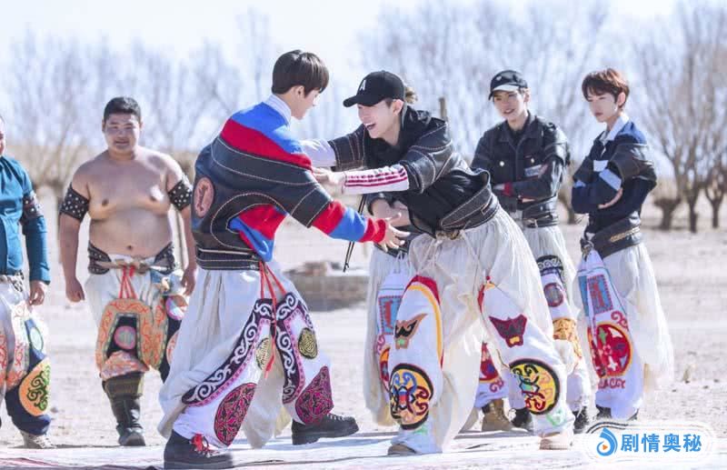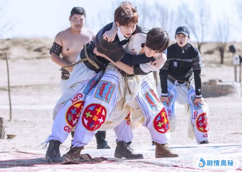 今日发布的这组剧照中,七名弟子分别穿上传统的蒙古摔跤,聚集到室外展开一场“两两对决”摔跤大赛。队长朱正廷与一向调皮的范丞丞两人组队较量,范丞丞率先出手推向朱正廷,暖心队长仅小幅度推挡,两人之间的互动温馨又友爱。而另一组选手李权哲和黄新淳则是激烈地扭打成一团,难分胜负。其中最引人注目的杨迪和毕雯珺组合,被称为“摔跤最萌身高差”,虽然杨迪从身高上不及毕雯珺的优势,但是上场气势可不熟,最终凭借下半身力量优势逆袭摔翻毕雯珺获得胜利。