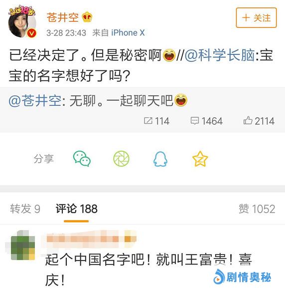 苍井空经常会在微博上与网友互动,有时候还会转评部分网友的留言。比如在3月28日,有网友向苍井空咨询苍井空腹中宝宝的姓名,但苍井空委婉拒绝了。苍井空表示,宝宝的姓名确实已经取号了,但这是秘密,并不愿意向公众透露。