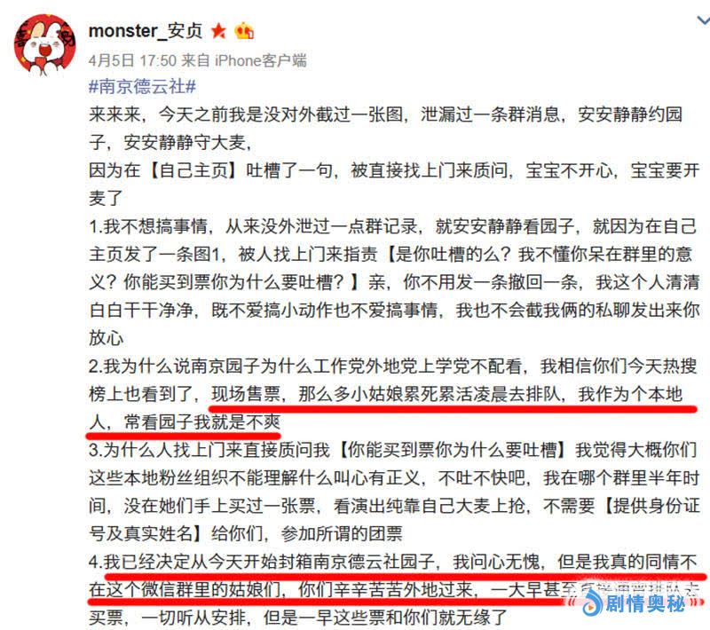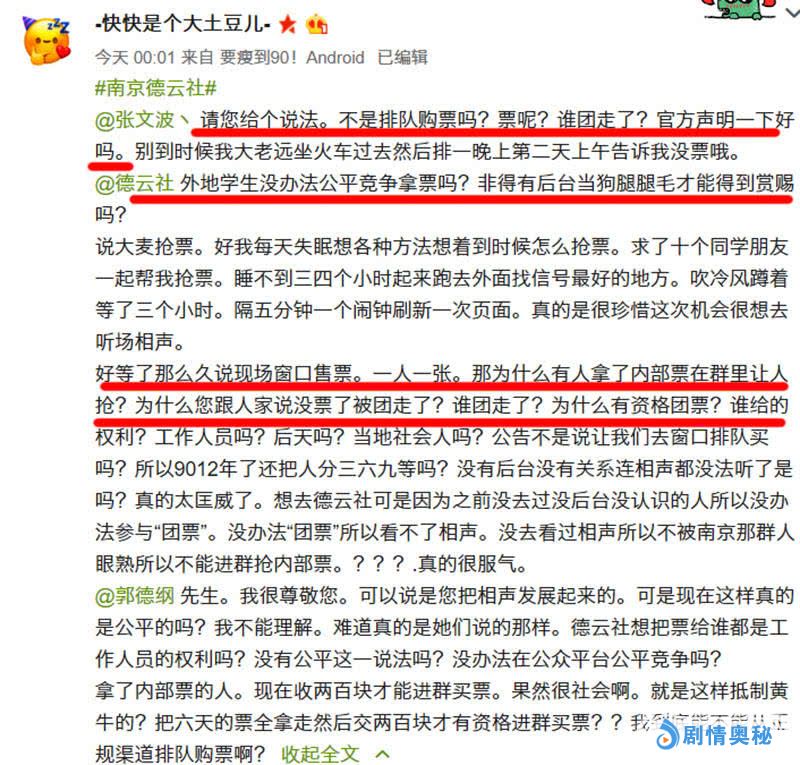 从4月5日晚间,几位网友先后在微博平台公开指责南京德云社园子,称其在门票销售上有不公平之嫌,微博网友“monster_安贞”首先提出质疑,称作为本地人,看不惯很多外地小姑娘为了看张云雷演出,累死累活凌晨去排队,结果却根本买不到票。