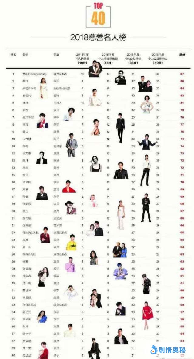 从2013年开始,杂志《中国慈善家》都会评出一个名人慈善榜,榜单内包括演员、歌手等娱乐圈人士,也包括体育界的一些名人。该榜单一般都会在3月底或者是四月初的时候揭晓,而最新一期的《中国慈善家》,公布了2018年年度名人慈善榜。