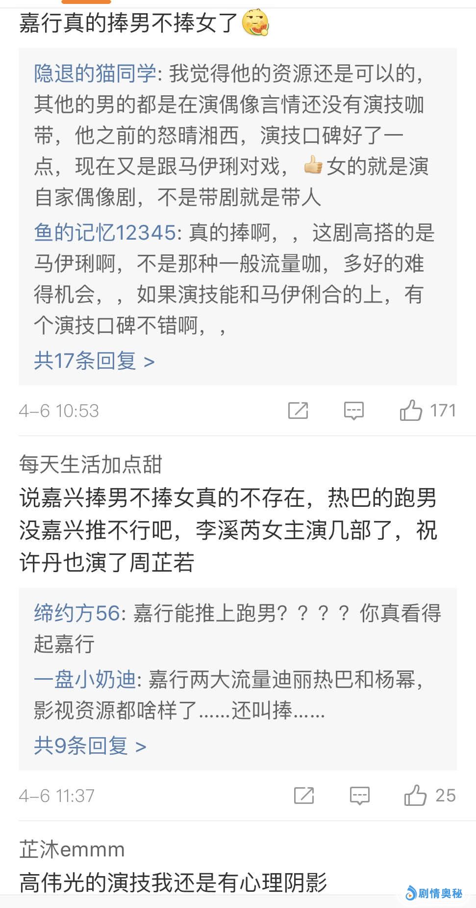 比如之前给李溪芮的资源,还在嘉行的时候,给了她好几部剧的女主,只不过剧太烂了而已。还有祝绪丹,现在给她的资源也不少,只是没有太突出。至于高伟光,不是很懂嘉行为什么会力捧他,因为关于恋情绯闻,高伟光就已经传出了两次了,一般来说,现在传出恋情,应该不算什么好事,如果想做实力派男演员就能够忽略这一点了。