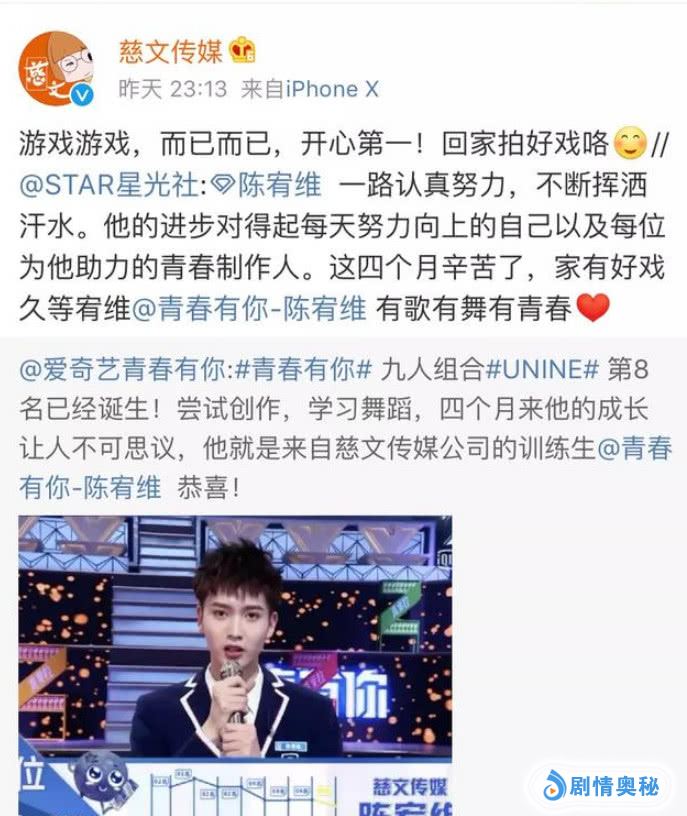 对此慈文公司老板疑似对结果不满直接黑脸走人了,而且慈文传媒还是国企,本身艺人就有高知名度高人气,这下子真的尴尬了,之后公开转发微博”游戏游戏,而已而已,开心第一!回家拍好戏咯“ 疑似公开diss青春有你节目组,网友:刚!