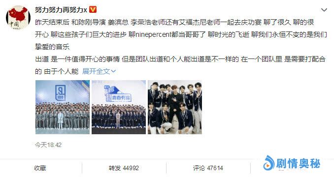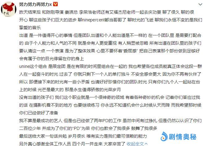 《青春有你》的总制片人张艺兴也发长文祝福了“UNINE”组合出道,从长文中张艺兴表示自己收获非常大做了两季的“制作人”他见证了200位练习生的成长,也很怀念与练习生在一起的时光。不过张艺兴也希望“NINE PERCENT”和“UNINE”两个组合能够团结,每一个表演是为了整体效果,不要怀有“委屈感”把自己负责的那部分做好,观众们的目光自然会停留在你的身上。