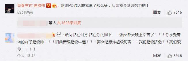 最后张艺兴还不忘鼓励那些错失“出道”机会的练习生希望他们能够为了自己的梦想继续努力奋斗,张艺兴这番语重心长的话语引起了不少练习生的回应,其中连淮伟的回复意味深长。连淮伟在下评论称“谢谢PD与自己聊了很多,后面我会继续努力。”可见连淮伟虽然失去了“出道机会”不过他仍然坚持自己的梦想,很多粉丝都希望连淮伟能够继续努力纷纷为连淮伟“打call”。
