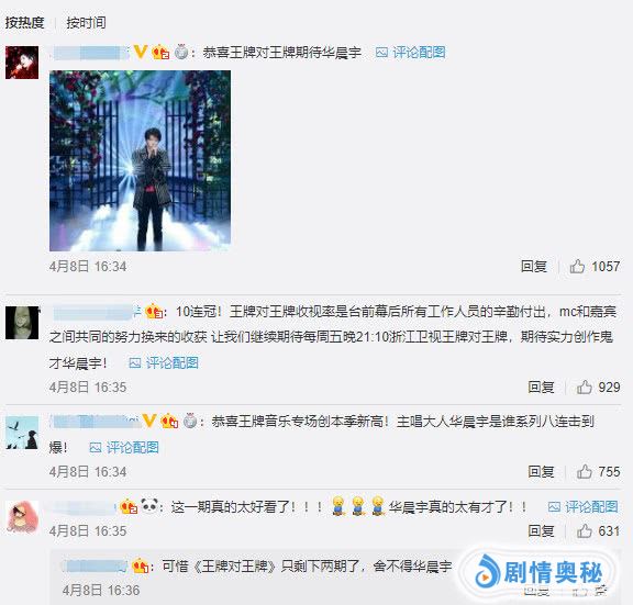 虽然表现出色的明星嘉宾有许多,不过当我们走进《王牌对王牌》官博评论区,我们可以看到观众最舍不得的还是华晨宇,前八条热评全部来自华晨宇的忠实粉丝,有粉丝评论道:恭喜《王牌对王牌》,期待华晨宇!有粉丝评论道:豪取10连冠,《王牌对王牌》能拿收视率冠军,是所有工作人员的努力,让我们一起期待《王牌对王牌》,期待实力创作鬼才华晨宇!还有粉丝评论道:还有两期就收官了,舍不得华晨宇。