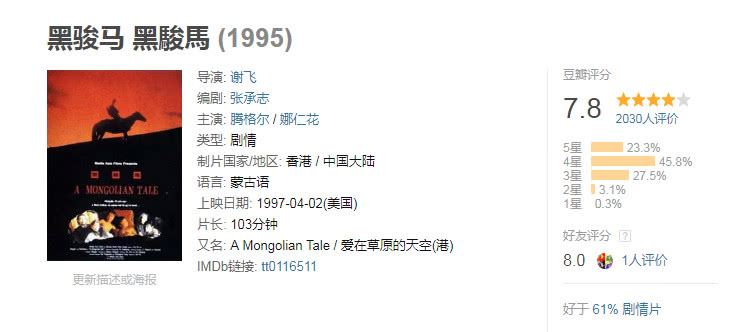 一个人注定是多面的,就像腾格尔这样,歌曲唱得好,演技也在线。1995年的这部《黑骏马》可谓是一部不可多得的好电影,浸透着离愁别绪,更是现代乡村和城市的悖论所在。
