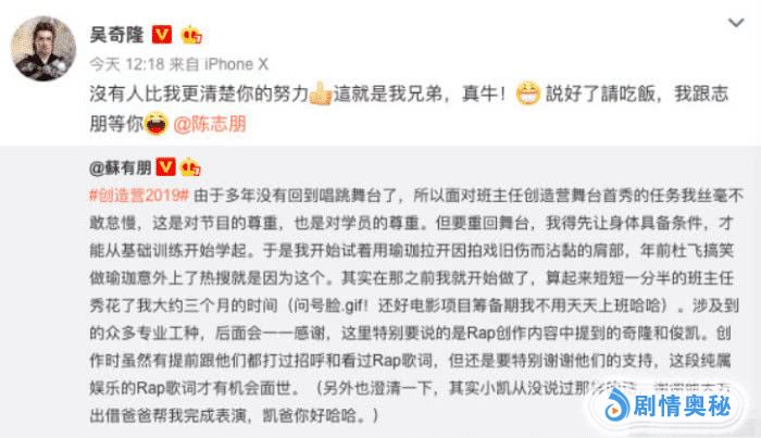 这一幕让苏有朋想起了当年“小虎队”的时候,自己因为要兼顾工作和学业导致舞蹈还是唱功方面都拖了后腿,不过吴奇隆和陈志朋两人却一直很照顾苏有朋,两人都会一直陪着苏有朋练习舞台练到深夜。因此苏有朋看到这一幕时感触很深,借着《创2》的舞台隔空喊话吴奇隆、陈志朋两人约饭。随后吴奇隆和陈志朋两人也回应苏有朋称“赶紧约起来”不得不说时隔30年了小虎队感情还是很深。