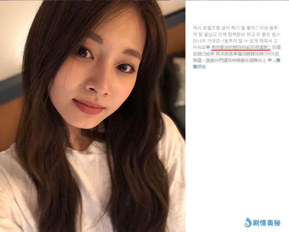 当然,暖心的子瑜还趁机自曝了最喜欢的自拍地点,她在配文写道:“果然饭店的灯自拍起来很满意~”有调皮的网友帮她配上文字“酒店灯光照亮我的美”,粉丝跟爱豆一样可爱呢~