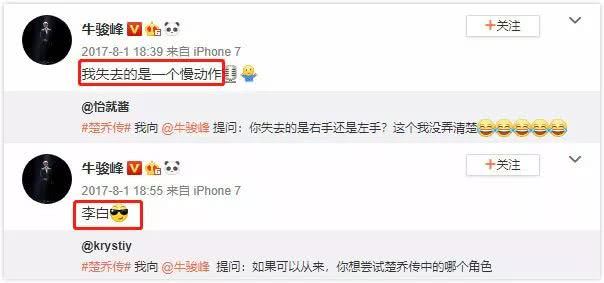 同理,面对粉丝“你(《楚乔传》元嵩)失去的是右手还是左手?”的问题时,他回答“我失去的是一个慢动作”,至于原因嘛,因为“跟着我左手右手一个慢动作”~