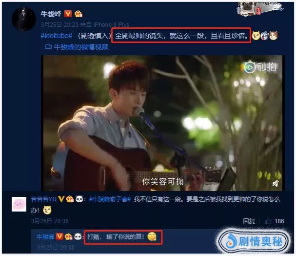 再比如,他平时和粉丝的相处模式也是相爱相杀。他本人说抱着吉他自弹自唱的画面是他在《夜空中最闪亮的星》全剧中最帅的镜头,被粉丝反驳后还扬言要和粉丝打赌。