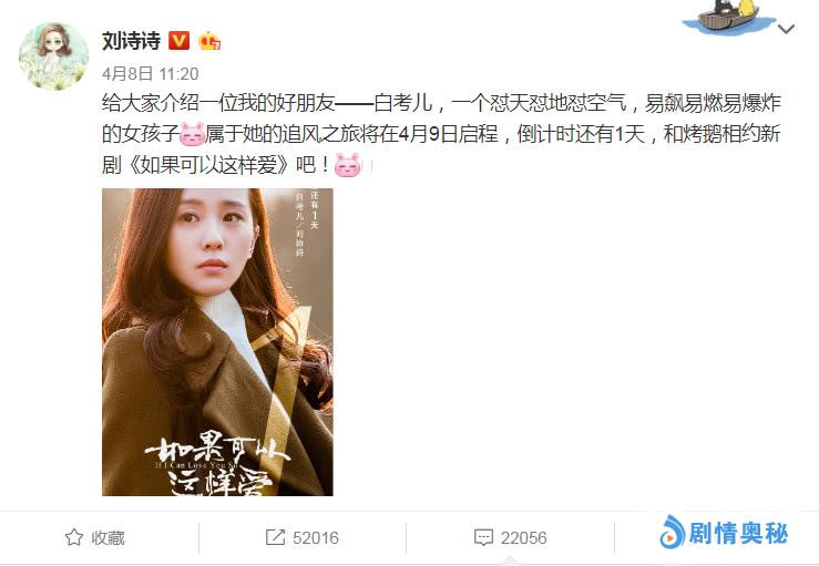 原来已经很久没有拍戏的刘诗诗,有一部已经杀青了好几年的电视剧终于要播出了,这部电视机剧的名字叫做《如果可以这样爱》,在剧中刘诗诗扮演的是女主演“白考儿”,一个性格非常直爽的女孩子,该剧即将在4月9日的时候跟观众见面,这个好消息也宣布得让粉丝有点措手不及。