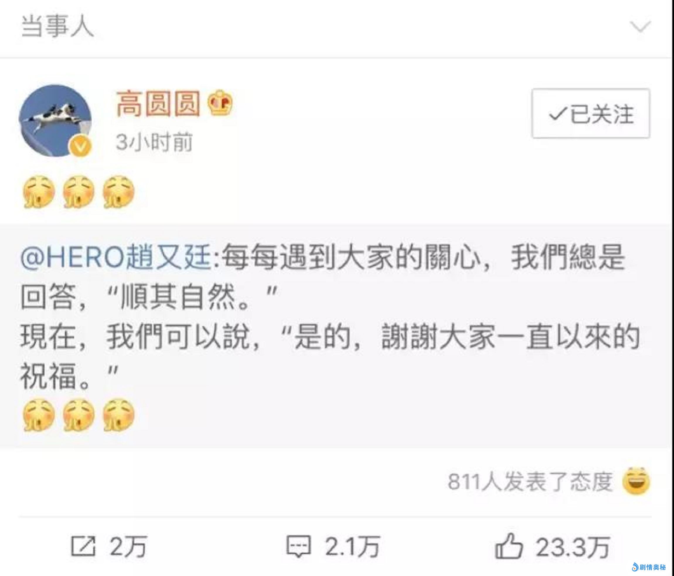 近日,赵又廷在微博中发了一条微博,内容的大意为,每次被大家关心(孩子的事),他们夫妻都总是说顺其自然,但是现在他们终于可以说是的,谢谢大家的关心。这一条微博一发,高圆圆也是紧跟着转发了,这是官宣怀孕啦。