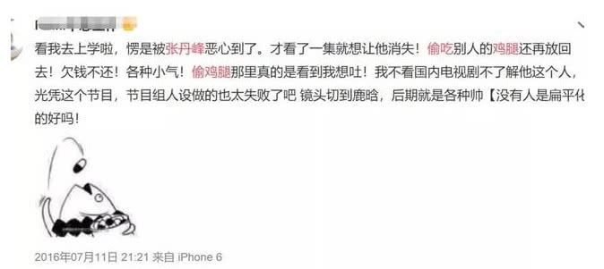 2016年张丹峰曾和大张伟、Ella等人一起参加《我去上学啦》这档综艺节目,节目中张丹峰的一些不好的行为让很多网友忍不住吐槽甚至路转黑。
