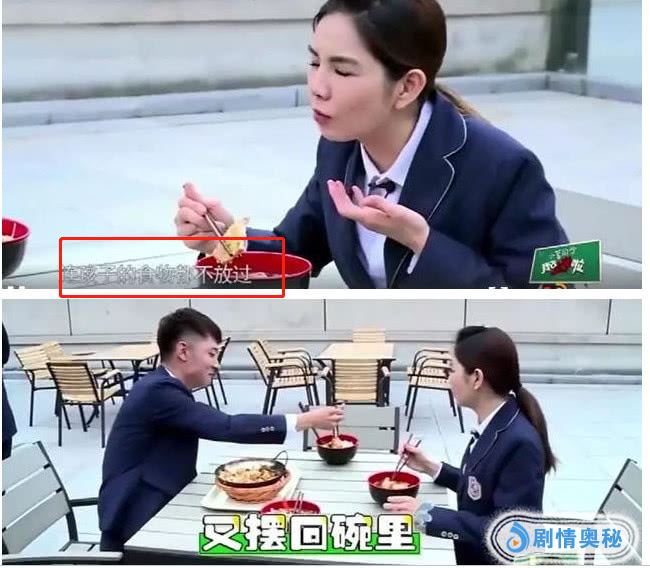 有一个镜头是张丹峰和Ella一起吃饭时,趁身边的两同学不在,张丹峰居然对别人碗里的鸡腿动了心思,并且明目张胆的把鸡腿夹到自己碗里,Ella见状,觉得此种行为不好赶忙制止,但张丹峰却还是我行我素,让人大跌眼镜的还在后面,咬了一大口后居然又把鸡腿放了回去!