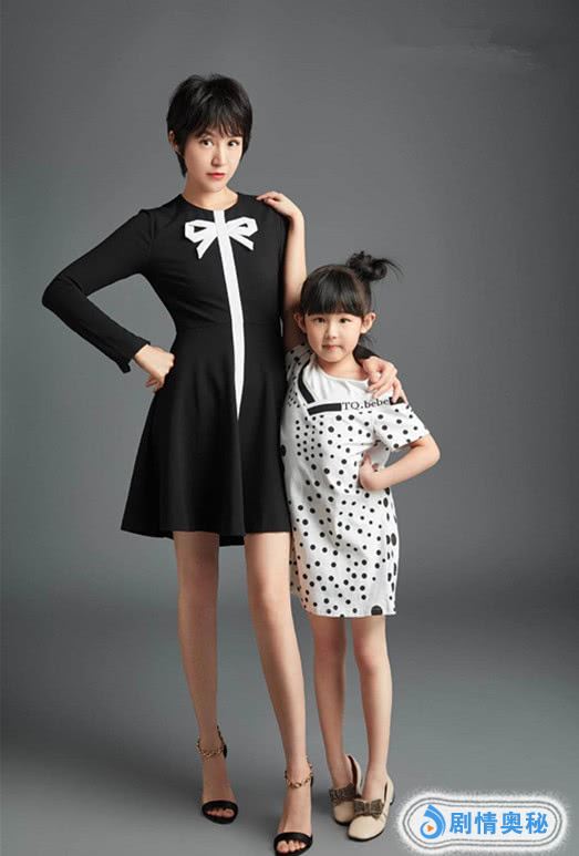 相比姐姐,扎起丸子头身着白色黑点连衣裙,与妈妈合照时踮着脚一手叉腰一手搭在妈妈肩头的小叶子,看上去就有些俏皮可爱了。