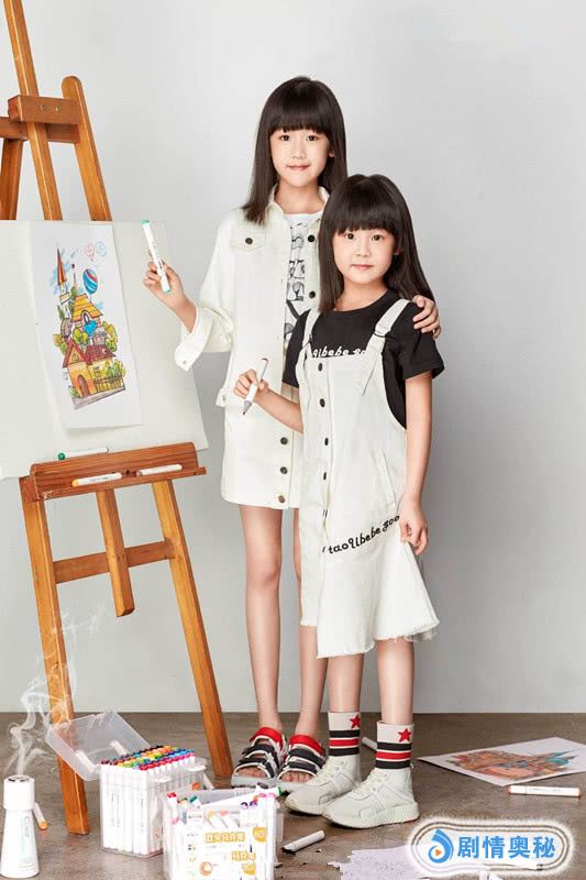 大片中十岁的贝儿身着一身白色套装,妹妹小叶子则穿着黑色T恤搭配白色背带裙,姐妹两个留着相似的发型,如果不看身高单看脸真的像是双胞胎。拍大片时,和妹妹小叶子站在画板前的贝儿,一手搂着妹妹,一手拿着画笔,如此一幕也是超有爱了。