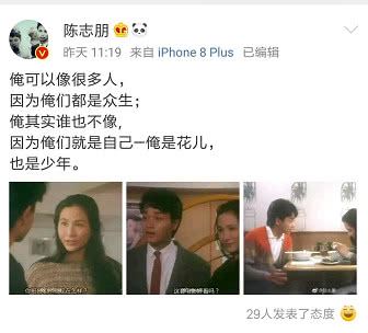 4月10号,因陈志朋撞脸港片打女郑佩佩引起网友的热议,对此,陈志朋还专门发了条微博回应此事。他表示:“俺可以像很多人,因为俺都是众生;俺其实谁都不像,因为俺们就是自己—俺是花儿,也是少年。”