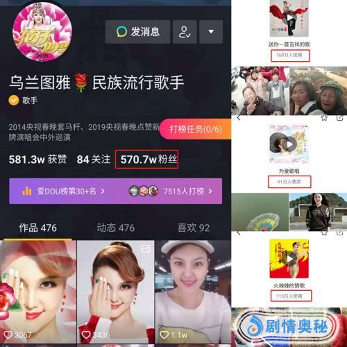 乌兰图雅,当今最具国际影响力、最受百姓喜爱的一代蒙古族青年歌手。近日,她的歌曲在短视频社交平台异常受欢迎:新歌《为爱歌唱》使用量达61万;经典作品如《火辣辣的情歌》使用量达113万,《送你一首吉祥的歌》使用量达168万,《凤凰飞》更是以279.7万使用量登上抖音“DOU听音乐榜”前三甲,这些歌曲大都是其数年前发布的歌曲,今年由于各种原因再度走红,刷屏了抖音和火山!而乌兰图雅本人在抖音和火山分别坐拥570.7万粉丝,这样的流量和影响力,在少数民族歌手中可以说是极为少见,也是颇为耀眼的。