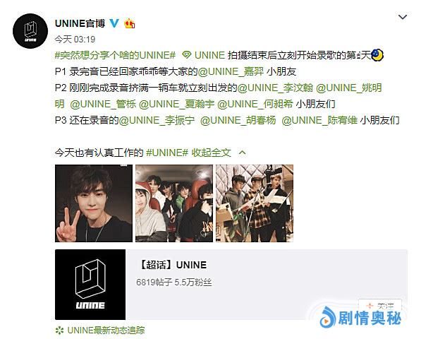 有关注UNINE官方微博的人都知道,这个账号是4月6日决赛当晚才开通的,但短短5天时间,关于成员们的动态,它更新得非常频繁,活跃度非常高,这也让粉丝们兴奋不已。