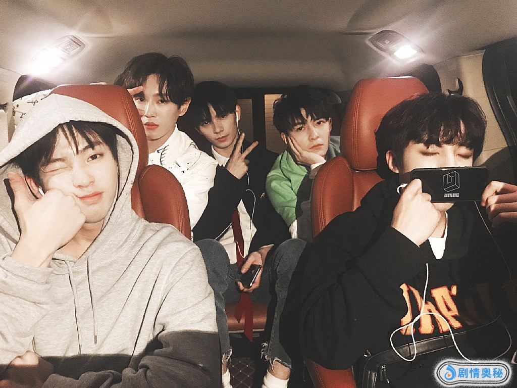 第二张图是才录完的姚明明、李汶翰、何昶希、管栎以及Vocal夏瀚宇,他们五个挤在一台车里。姚明明身穿灰色拼接黑色的连帽卫衣,几根零碎的头发披在额头,右手竖起大拇指,还对着镜头wink了一下,超可爱呀~看来心情还是很不错呢!