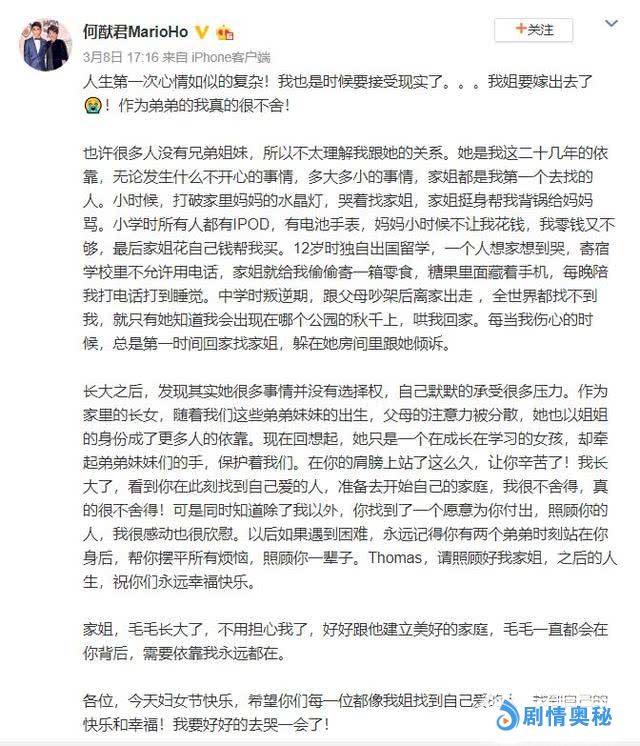 在上个月的时候,何猷君便曾在微博上发长文说到何超盈的婚事,还晒出了何超盈的素颜照,内容更多的体现的则是姐弟情深,姐姐出嫁,弟弟表现出强烈的不舍。长兄如父、长姐如母,在赌王这样的大家庭体现的更为明显,在照顾弟弟妹妹这件事上,何超盈尽到了自己应尽的责任,赢得了弟弟的尊重,何猷君这段长文很走心,看哭了很多人,虽然很多不舍,但还是为姐姐找到自己的幸福而感到快乐。