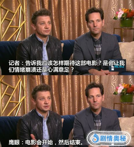 今天尤其要说的是蚁人和鹰眼这两位,看到采访的时候,小编直接笑喷了。记者提问:告诉我应该怎样期待这部电影,是会让我们情绪崩溃还是心满意足。鹰眼回复:电影会开始,然后结束!这样的回答,小编是生平第一次看到,之前反正是没看到过。如果大家觉得,这个没什么,接着来看。