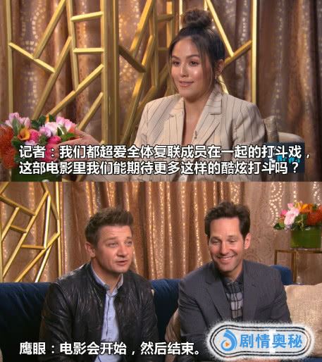 现在大家是不是能想到鹰眼会怎么回答了,不错还是那句话:电影会开始,然后结束。之后的聊天当中,每次遇到关于《复联4》的问题,这对好兄弟都是拒绝回答。记者知道,这部电影他们允许把秘密告诉一个人,当问到这个问题的时候,艺人和鹰眼默契的指了一下对方。