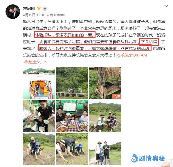 4月11日,霍启刚发文称,利用周末,一家三口人去体验插秧生活,言传身教让孩子懂得“谁知盘中餐,粒粒皆辛苦”的真正含义。还呼吁大家支持乐施会义卖米大行动。只是他们正能量教育的冰山一角!