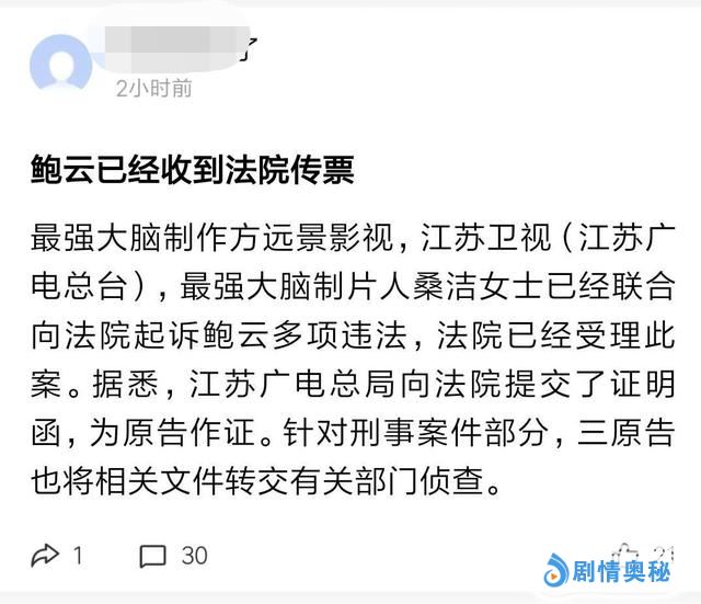 最近刚有消息称鲍云方面收到江苏卫视联合制片人桑洁状告他的传票,看起来双方是要短兵相见了,很多网友对鲍云十分支持却也十分担心,因为毕竟魏坤琳背后的节目组掌握了更多的资源以及信息,所以这么看来鲍橒还是比较吃亏的。