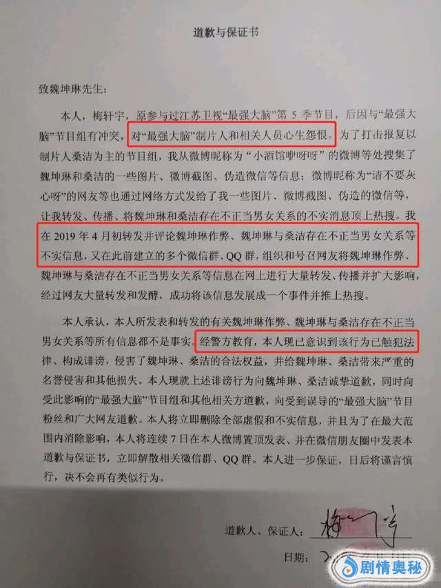 但是让人更加跌破眼镜的是,那个“魏坤琳出轨制片人桑洁”的造谣者梅轩宇,公开了道歉信给魏坤琳,声称是曾经参与“最强大脑”的工作,因为与节目组发生冲突,所以对制片以及相关人员怀恨在心,所以制造了谣言。这个无疑是给鲍橒一个暴击,真的是太心疼鲍橒了。