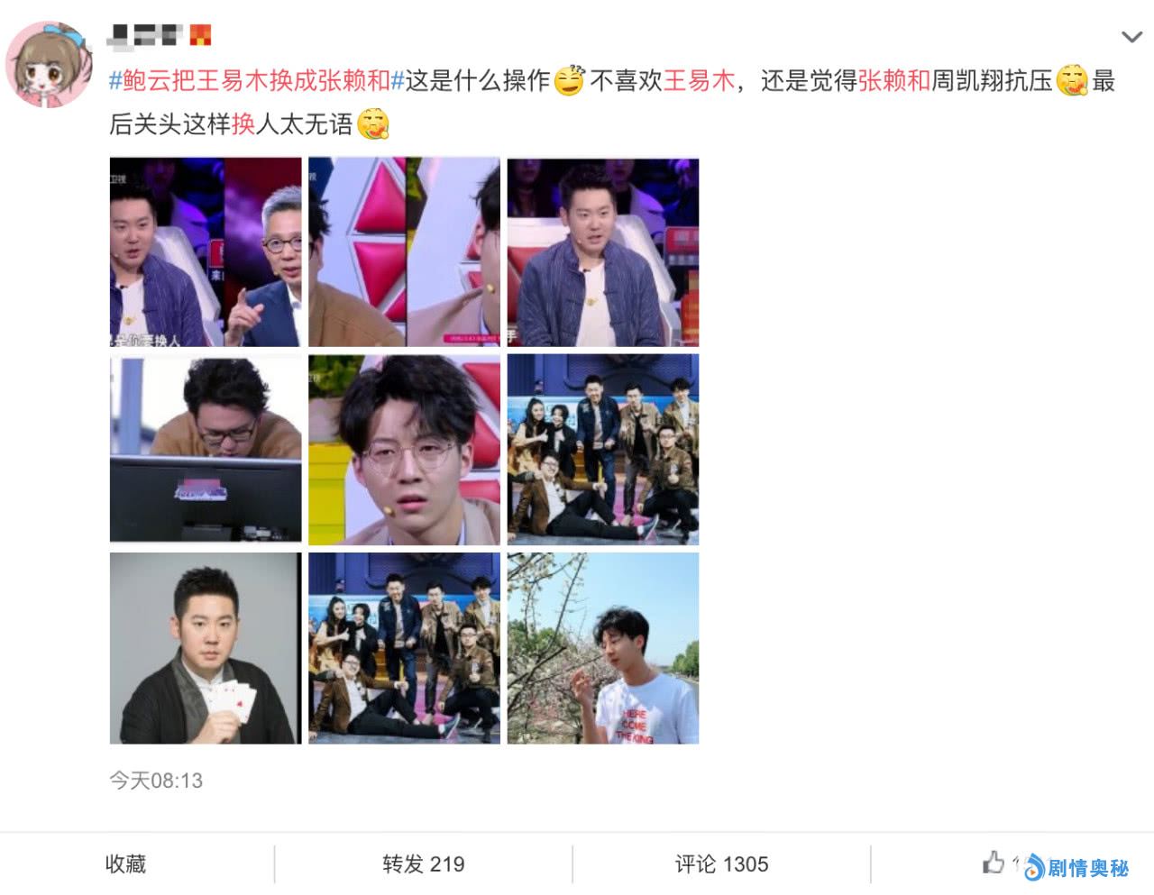 最新一期《最强大脑》刚播完,关于鲍云把王易木换成张赖和的热搜就一直占在微博热搜榜前列,而多位大V博主都是清一色的发博称鲍云这样临时换人太让人无语,所有矛头直指鲍云,但根据周凯翔、王德才、张丰豪等人最开始的发博删博操作,节目组似乎有意把舆论压力指向鲍队,为什么这么说呢?