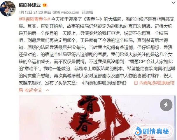 《青春斗》编剧曝原版大结局,赵聪向真国外重逢,香葱CP大团圆。昨天晚上《青春斗》大结局了,最终的结局是悲剧,五姐妹各自分别了,她们都去追求自己的梦想了,开启了新的生活,只留下向真一个人面对生活,大家期待赵聪回归也 并没有,而编剧却发微博爆出了原版结局,原版结局才是大团圆啊,香葱CP在巴黎重逢,幸福相拥,然而,编剧却让结局遗憾收场,到底是为什么呢?大家更喜欢哪一个结局呢?