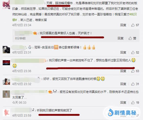 有网友称“姚贝娜的声音真的好听,可惜早早就离开的人世”。还有网友称“姚贝娜的声音一出来眼睛就控制不住,很想到现场听一下姚贝娜的歌声。”还有网友称“听到姚贝娜的原声,仿佛又回到了当年追甄嬛传的时候,好怀念啊”。小编觉得姚贝娜可以说近几年来最有实力的女歌声,她的唱功和原创能力不输于王菲、那英等人,如今还深得刘欢的认可。如果姚贝娜还在世的话或许能够听到更多更好的作品的。