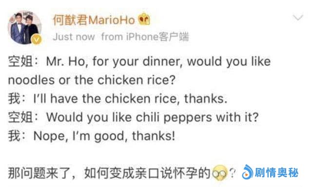 不过在这个消息被曝光之后,何猷君很快就已经在社交平台上澄清了这是一条假消息,并且他还原了事情的经过。从何猷君的公布的内容来看,他的确是与奚梦瑶一同搭乘飞机,且陪同对方进食,而在过程中也有空姐来咨询,但是对话内容并不是传闻中所说的自曝女友怀孕,根本上来说就是一段再平常不过的交流,很明显整个对话被人篡改继而变成了自曝女友怀孕的假消息,所以何猷君自己也发反问“如何变成亲口说怀孕了?”