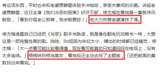 而近日伴随贾静雯主演的新剧《我们与恶的距离》迎来开播,一向宠妻的修杰楷除了追剧以及给予老婆贾静雯各种夸赞之外,力捧老婆新剧的他也透露梧桐妹也有在追剧,而且十分喜欢,看完后还主动去找了主题曲,而且还补上了前面的集数,如此一幕也是超温馨了。