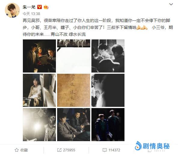 为了不留遗憾,朱一龙经历重重考验,没有任何假期,朱一龙全身心投入剧组,他希望带给原著读者和观众最贴合原著的小三爷吴邪,虽然这个角色已经被李易峰、鹿晗等人演绎过。艰苦拍摄180余天,朱一龙大作终于顺利杀青,朱一龙写道:再见吴邪,很荣幸陪伴你走过人生的这个阶段,我知道你的脚步不会停下,小哥、小白、瞎子、王胖子,你们都辛苦了,三叔手下留情,期待你的未来,青山不改,绿水长流。