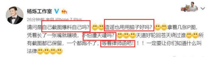 正当广大网友和粉丝惊讶之余,杨烁通过工作室迅速辟谣,申明三点:1,,截图中的聊天记录均为造谣。2,图是P的,谣是造的。3,保留证据,交给律师处理。