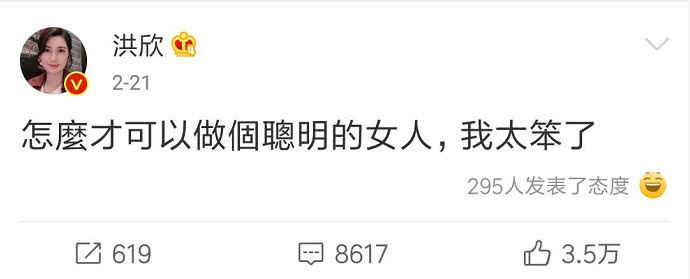洪欣在今年2月份曾发过这样一条动态,内容是:“怎么才可以做个聪明的女人?我太笨了!”这句话给人感觉就是洪欣在婚姻生活中遇到难题了,而且是连她这样聪明美丽的女人都难以应付的。因为在大家的印象中,洪欣不仅长相靓丽,气场强大,而且是个情商很高的女人,结果却会在年初发出这样的感慨。
