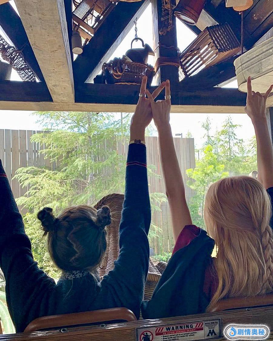 Rosé也在个人ins上分享了一系列游玩的图片。当天Rosé把一部分金发编成仙女辫,LISA的发型则是可爱的哪吒头,青春又活泼。两人坐在游乐设施中,双手举起,一个比剪刀手,一个比爱你的手势,看来是玩得很开心了。