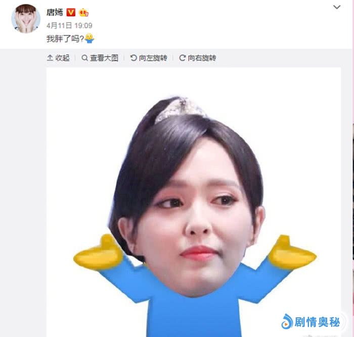 在这次活动的照片中,她身上穿着白色的西装,倒是看不出有太胖,但唐嫣的脸确实肿了一圈,一向尖尖的瓜子脸也变成了圆脸。不过她本人对此的回应倒是落落大方,配了一张表情包,调皮的问大家自己真的胖了吗?