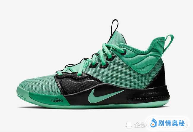 绿色,这是不一样的绿色,真的很吸引人,大家都知道保罗乔治有一个很喜欢的爱好就是钓鱼,这是他打球职业之外的一个爱好,这双鞋鞋身采用薄荷绿搭配黑色鱼鳞皮革呈现,中底原有的家乡区号改为鱼类图标示人,并在鞋垫也采用特别图案点缀。