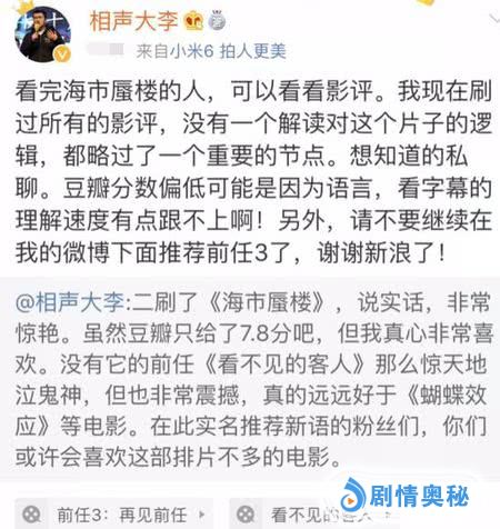 而这段时间,除了演出拿奖之外,李宏烨也抽时间去看了几场电影,前不久,李宏烨曾点评了同行于谦监制并主演的作品《老师,好》,李宏烨认为,电影不应该总是讲坏孩子叛逆的故事,自己也要拍一部电影,要讲好孩子成长的故事,还说,客串明星太多了,自己不太喜欢。最近,李宏烨博士又评价了西班牙电影《海市蜃楼》,这是导演奥利奥尔·保罗继《看不见的客人》之后又一部口碑佳作,李宏烨博士看完之后也盛赞这部作品,并且李宏烨表示:我现在刷过所有的影评,没有一个解读对这个片子的逻辑,都略过了一个重要的节点。感兴趣的可以和自己聊一聊。