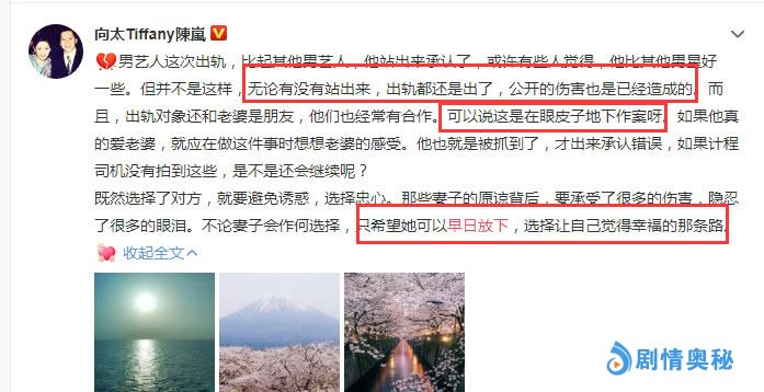 向太陈岚看不过去,凌晨4点发文力挺郑秀文,主要强调三点:1,无论是否站出来承认,出轨就是出轨,伤害就是伤害。2,跟熟人出轨时怎么没考虑老婆的感受?如果不是被拍到是否还会继续出轨?3,希望郑秀文可以早日放下,做出自己认为正确的选择。小编赞同向太的想法,如果所有艺人出轨后,都开发布会认错,痛哭流涕一下,大众就可以原谅他,那道德底线在哪里?认错是一件事,改错是另一件事,一码是一码。