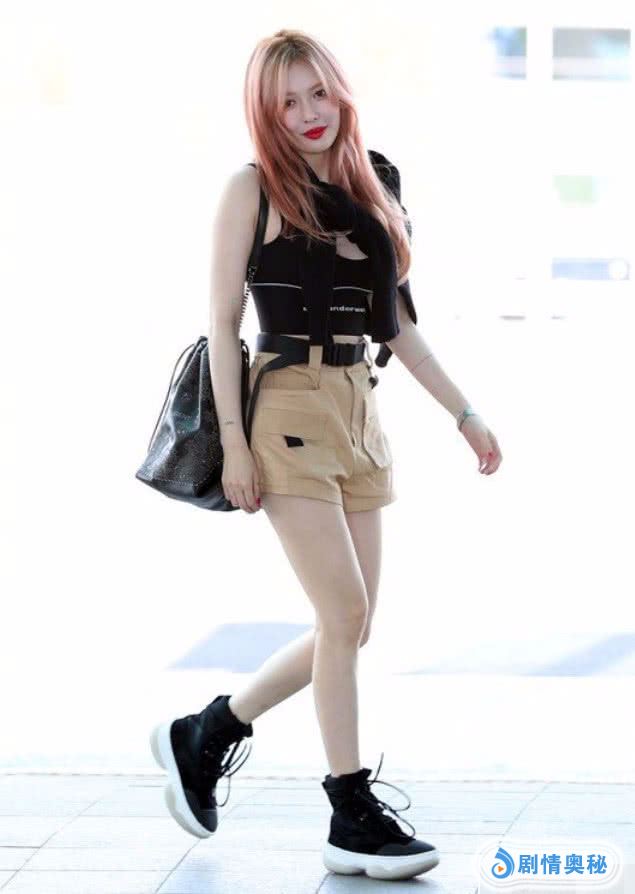 她这次穿了一件黑色紧身上衣,比较紧身,所以侧面看上去身材凹凸有致,简直完美,搭配一条简单卡其色工装裤,短裤清爽大方,直到看到她的鞋子,结果泫雅不爱匡威和老爹鞋了。
