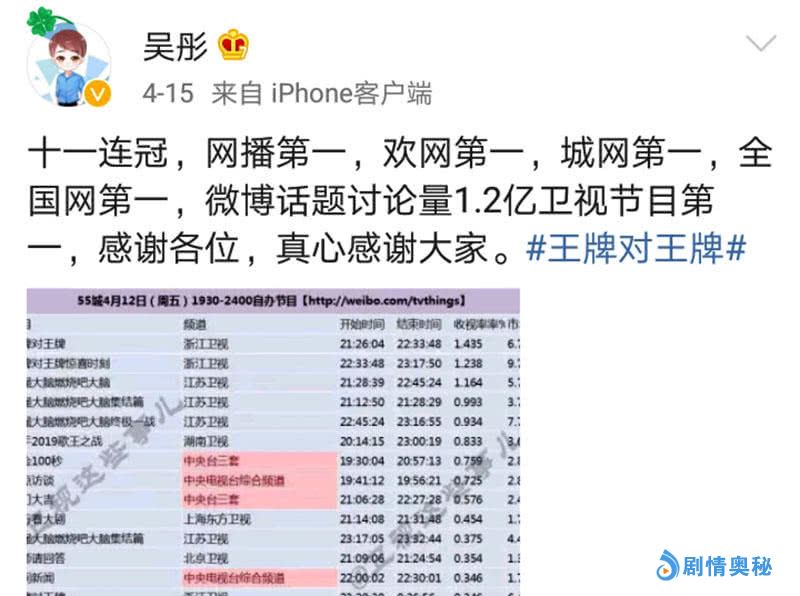 前不久,浙江卫视节目中心副主任,《王牌对王牌》、《我就是演员》节目总制片人吴彤在社交平台发布了一则消息,称上周五播出的《王牌对王牌》倒数第二期节目,再次获得十一连冠,网播第一,话题讨论量位居各大卫视榜首。