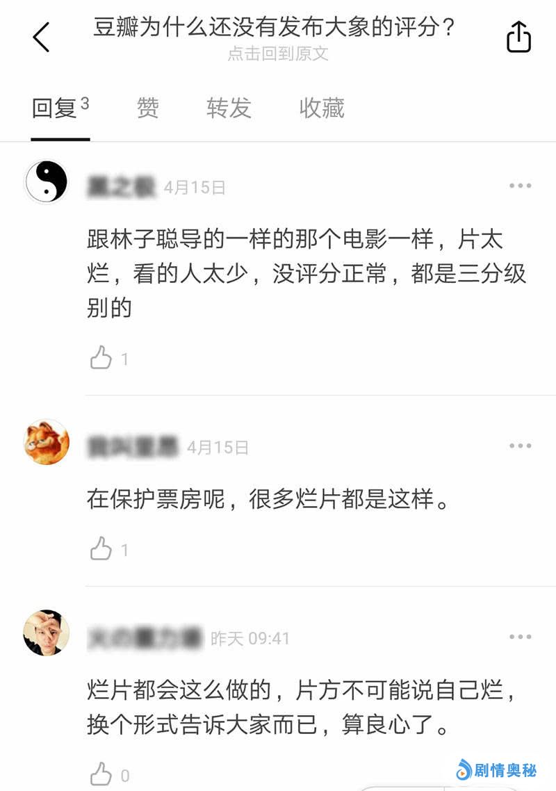 分析一下票房,截止到本文发布时间,《最佳男友进化论》1300万,《欲念游戏》706万,《在乎你》466万,《我的宠物是大象》最低,票房只有240万。也就是说,四部影片对比下来,最高和高低的都没有给出评分,反而是排在中间的两个给了不及格的低分。如果像个别网友所称的,原因是口碑差、片太烂、看的人少,不出评分是在保护票房,那为什么《欲念游戏》和《在乎你》的口碑也不好,却早早的给出了豆瓣得分呢?