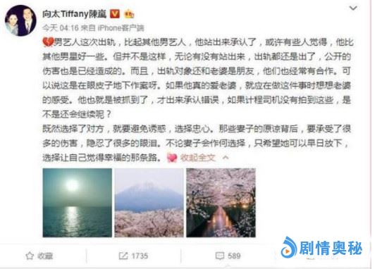 4月17日上午向太陈岚也在微博发文评价此事,似在劝诫郑秀文放弃许志安,称“如果他真的爱老婆,就应在做这件事时想想老婆的感受,被抓到才出来承认错误,如果计程车司机没拍到这些,是不是还会继续呢?”